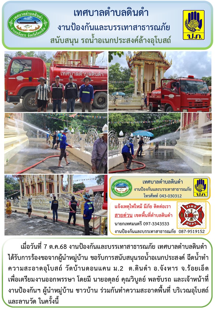 \r\nได้รับการร้องขอจากผู้นำหมู่บ้าน ขอรับการสนับสนุนรถน้ำอเนกประสงค์ ฉีดน้ำทำความสะอาดอุโบสถ์ วัดบ้านดอนแคน ม.2 ต.ดินดำ อ.จังหาร จ.ร้อยเอ็ด เพื่อเตรียมงานออกพรรษา โดยมี นายอดุลย์ คุณวิบูลย์ พลขับรถ และเจ้าหน้าที่งานป้องกันฯ ผู้นำหมู่บ้าน ชาวบ้าน ร่วมกันทำความสะอาดพื้นที่ บริเวณอุโบสถ์ และลานวัด ในครั้งนี้