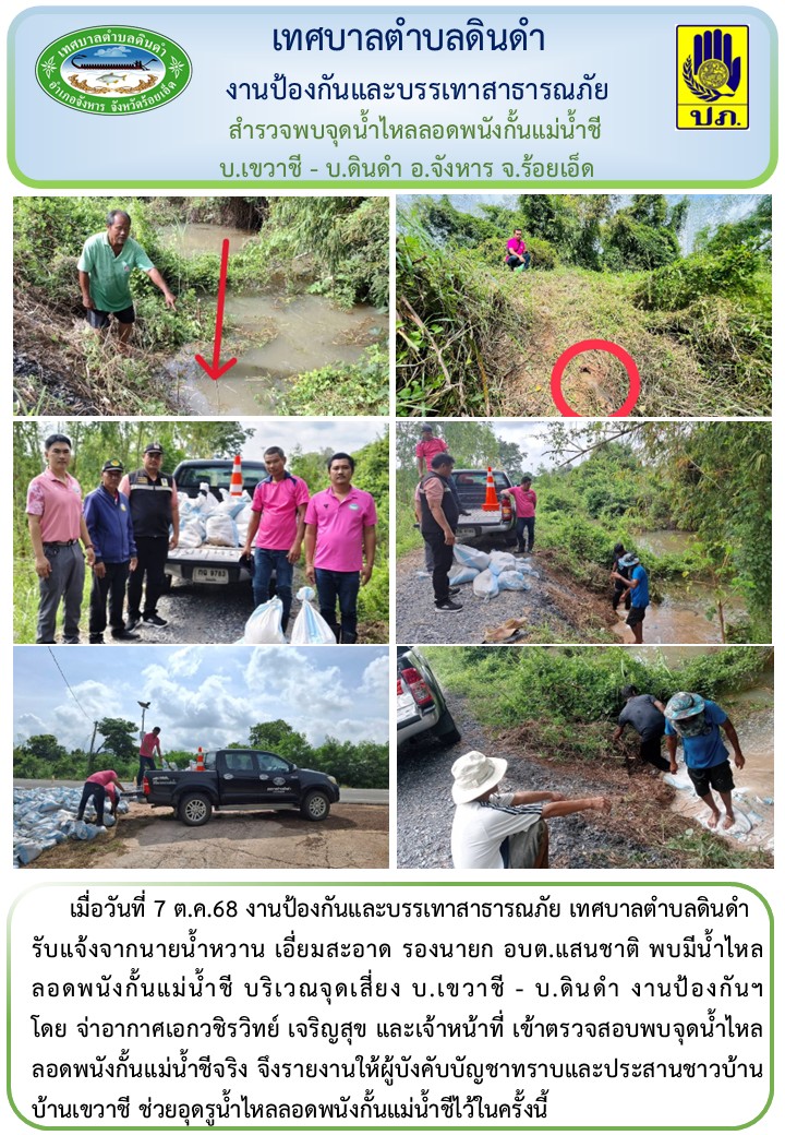 \r\nรับแจ้งจากนายน้ำหวาน เอี่ยมสะอาด รองนายก อบต.แสนชาติ พบมีน้ำไหลลอดพนังกั้นแม่น้ำชี บริเวณจุดเสี่ยง บ.เขวาชี - บ.ดินดำ งานป้องกันฯ โดย จ่าอากาศเอกวชิรวิทย์ เจริญสุข และเจ้าหน้าที่ เข้าตรวจสอบพบจุดน้ำไหลลอดพนังกั้นแม่น้ำชีจริง จึงรายงานให้ผู้บังคับบัญชาทราบและประสานชาวบ้าน บ้านเขวาชี ช่วยอุดรูน้ำไหลลอดพนังกั้นแม่น้ำชีไว้ในครั้งนี้