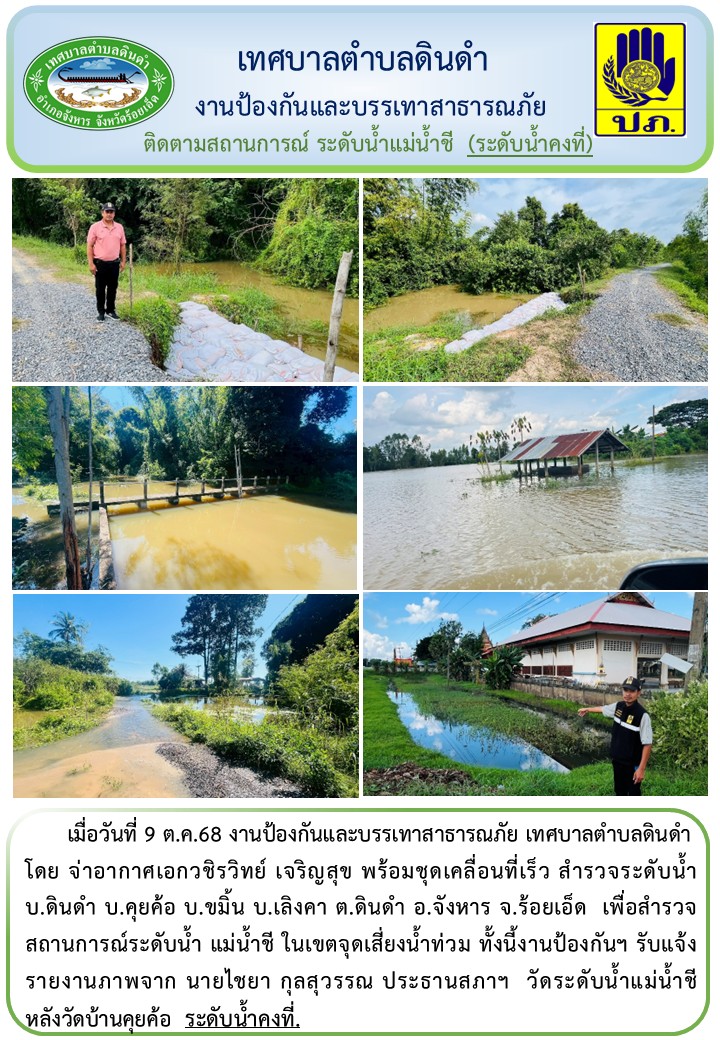 \r\nโดย จ่าอากาศเอกวชิรวิทย์ เจริญสุข พร้อมชุดเคลื่อนที่เร็ว สำรวจระดับน้ำ บ.ดินดำ บ.คุยค้อ บ.ขมิ้น บ.เลิงคา ต.ดินดำ อ.จังหาร จ.ร้อยเอ็ด เพื่อสำรวจสถานการณ์ระดับน้ำ แม่น้ำชี ในเขตจุดเสี่ยงน้ำท่วม ทั้งนี้งานป้องกันฯ รับแจ้งรายงานภาพจาก นายไชยา กุลสุวรรณ ประธานสภาฯ วัดระดับน้ำแม่น้ำชี หลังวัดบ้านคุยค้อ ระดับน้ำคงที่.