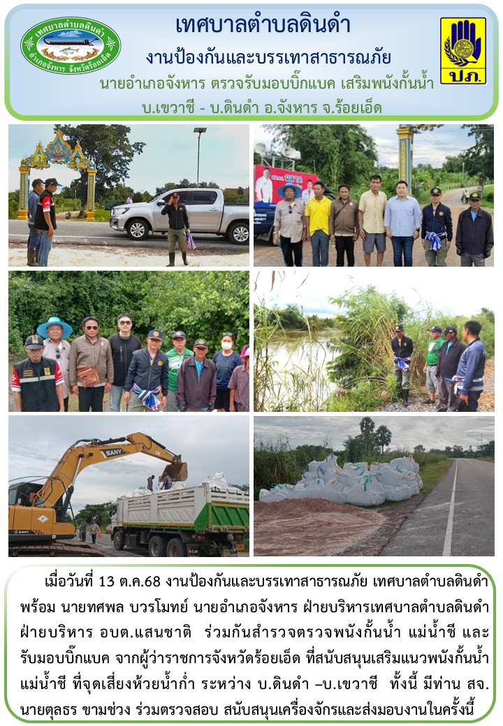\r\nพร้อม นายทศพล บวรโมทย์ นายอำเภอจังหาร ฝ่ายบริหารเทศบาลตำบลดินดำฝ่ายบริหาร อบต.แสนชาติ ร่วมกันสำรวจตรวจพนังกั้นน้ำ แม่น้ำชี และ รับมอบบิ๊กแบค จากผู้ว่าราชการจังหวัดร้อยเอ็ด ที่สนับสนุนเสริมแนวพนังกั้นน้ำ แม่น้ำชี ที่จุดเสี่ยงห้วยน้ำก่ำ ระหว่าง บ.ดินดำ –บ.เขวาชี ทั้งนี้ มีท่าน สจ. นายตุลธร ขามช่วง ร่วมตรวจสอบ สนับสนุนเครื่องจักรและส่งมอบงานในครั้งนี้
