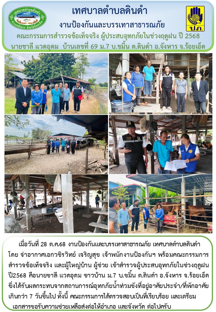 \r\nโดย จ่าอากาศเอกวชิรวิทย์ เจริญสุข เจ้าพนักงานป้องกันฯ พร้อมคณะกรรมการสำรวจข้อเท็จจริง และผู้ใหญ่บ้าน ผู้ช่วย เข้าสำรวจผู้ประสบอุทกภัยในช่วงฤดูฝน ปี 2568 คือนายชาลี แวดอุดม ชาวบ้าน ม.7 บ.ขมิ้น ต.ดินดำ อ.จังหาร จ.ร้อยเอ็ด ซึ่งได้รับผลกระทบจากสถานการณ์อุทกภัยน้ำท่วมขังที่อยู่อาศัยประจำ/ที่พักอาศัย เกินกว่า 7 วันขึ้นไป ทั้งนี้ คณะกรรมการได้ตรวจสอบเป็นที่เรียบร้อย และเตรียม