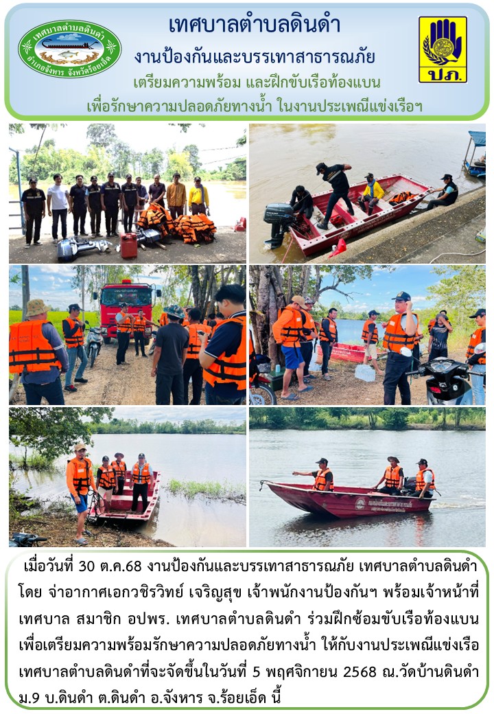 \r\nโดย จ่าอากาศเอกวชิรวิทย์ เจริญสุข เจ้าพนักงานป้องกันฯ พร้อมเจ้าหน้าที่เทศบาล สมาชิก อปพร. เทศบาลตำบลดินดำ ร่วมฝึกซ้อมขับเรือท้องแบน เพื่อเตรียมความพร้อมรักษาความปลอดภัยทางน้ำ ให้กับงานประเพณีแข่งเรือเทศบาลตำบลดินดำที่จะจัดขึ้นในวันที่ 5 พฤศจิกายน 2568 ณ.วัดบ้านดินดำ ม.9 บ.ดินดำ ต.ดินดำ อ.จังหาร จ.ร้อยเอ็ด นี้