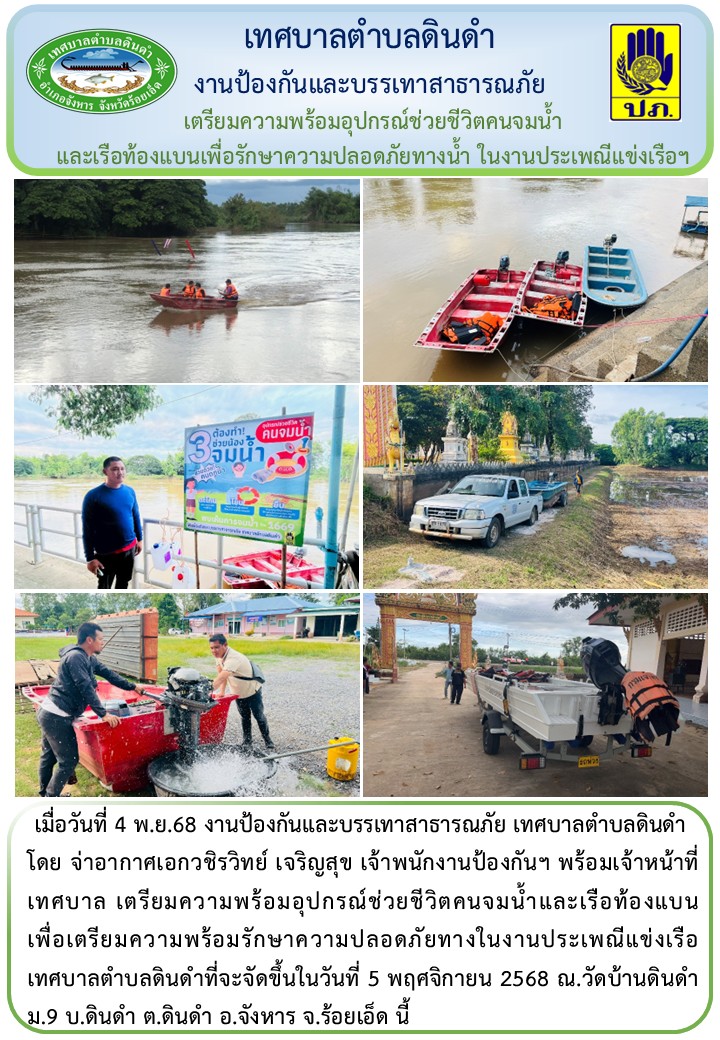 \r\nโดย จ่าอากาศเอกวชิรวิทย์ เจริญสุข เจ้าพนักงานป้องกันฯ พร้อมเจ้าหน้าที่เทศบาล เตรียมความพร้อมอุปกรณ์ช่วยชีวิตคนจมน้ำและเรือท้องแบน เพื่อเตรียมความพร้อมรักษาความปลอดภัยทางในงานประเพณีแข่งเรือเทศบาลตำบลดินดำที่จะจัดขึ้นในวันที่ 5 พฤศจิกายน 2568 ณ.วัดบ้านดินดำ ม.9 บ.ดินดำ ต.ดินดำ อ.จังหาร จ.ร้อยเอ็ด นี้