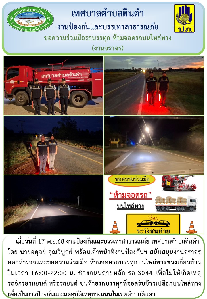 โดย นายอดุลย์ คุณวิบูลย์ พร้อมเจ้าหน้าที่งานป้องกันฯ สนับสนุนงานจราจร ออกสำรวจและขอความร่วมมือ ห้ามจอดรถบรรทุกบนไหล่ทางช่วงเกี่ยวข้าว ในเวลา 16:00-22:00 น. ช่วงถนนสายหลัก รอ 3044 เพื่อไม่ให้เกิดเหตุรถจักรยานยนต์ หรือรถยนต์ ชนท้ายรถบรรทุกที่จอดรับข้าวเปลือกบนไหล่ทาง เพื่อเป็นการป้องกันและลดอุบัติเหตุทางถนนในเขตตำบลดินดำ