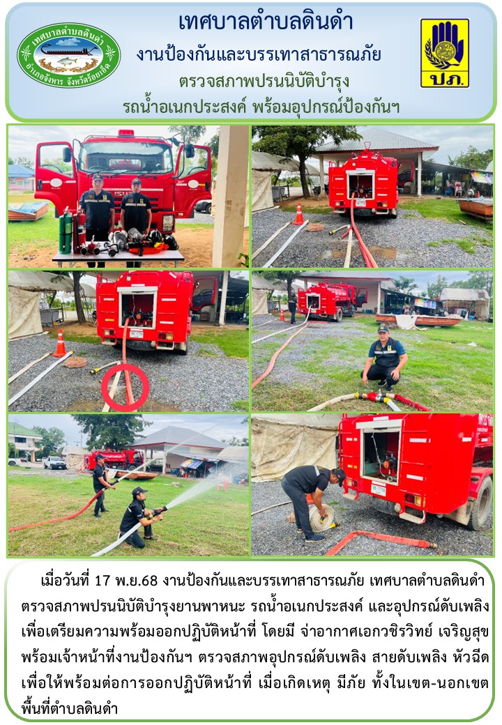 ตรวจสภาพปรนนิบัติบำรุงยานพาหนะ รถน้ำอเนกประสงค์ และอุปกรณ์ดับเพลิง เพื่อเตรียมความพร้อมออกปฏิบัติหน้าที่ โดยมี จ่าอากาศเอกวชิรวิทย์ เจริญสุข พร้อมเจ้าหน้าที่งานป้องกันฯ ตรวจสภาพอุปกรณ์ดับเพลิง สายดับเพลิง หัวฉีด เพื่อให้พร้อมต่อการออกปฏิบัติหน้าที่ เมื่อเกิดเหตุ มีภัย ทั้งในเขต-นอกเขต พื้นที่ตำบลดินดำ