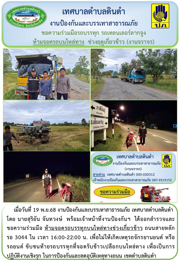โดย นายสุริยัน จันทวงษ์ พร้อมเจ้าหน้าที่งานป้องกันฯ ได้ออกสำรวจและขอความร่วมมือ ห้ามจอดรถบรรทุกบนไหล่ทางช่วงเกี่ยวข้าว ถนนสายหลัก รอ 3044 ใน เวลา 16:00-22:00 น. เพื่อไม่ให้เกิดเหตุรถจักรยานยนต์ หรือรถยนต์ ขับชนท้ายรถบรรทุกที่จอดรับข้าวเปลือกบนไหล่ทาง เพื่อเป็นการปฏิบัติงานเชิงรุก ในการป้องกันและลดอุบัติเหตุทางถนน เขตตำบลดินดำ