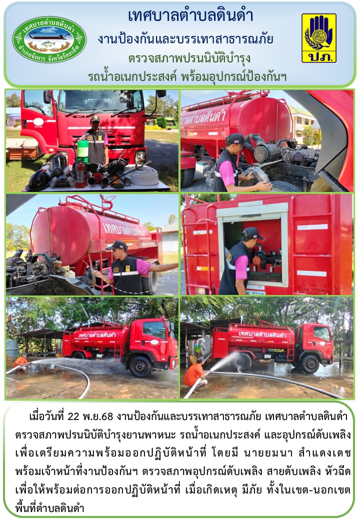 ตรวจสภาพปรนนิบัติบำรุงยานพาหนะ รถน้ำอเนกประสงค์ และอุปกรณ์ดับเพลิง เพื่อเตรียมความพร้อมออกปฏิบัติหน้าที่ โดยมี นายยมนา สำแดงเดช พร้อมเจ้าหน้าที่งานป้องกันฯ ตรวจสภาพอุปกรณ์ดับเพลิง สายดับเพลิง หัวฉีด เพื่อให้พร้อมต่อการออกปฏิบัติหน้าที่ เมื่อเกิดเหตุ มีภัย ทั้งในเขต-นอกเขต พื้นที่ตำบลดินดำ
