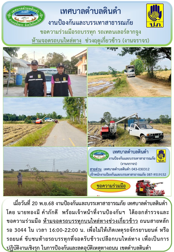 โดย นายทองมี คำภักดี พร้อมเจ้าหน้าที่งานป้องกันฯ ได้ออกสำรวจและ ขอความร่วมมือ ห้ามจอดรถบรรทุกบนไหล่ทางช่วงเกี่ยวข้าว ถนนสายหลัก รอ 3044 ใน เวลา 16:00-22:00 น. เพื่อไม่ให้เกิดเหตุรถจักรยานยนต์ หรือรถยนต์ ขับชนท้ายรถบรรทุกที่จอดรับข้าวเปลือกบนไหล่ทาง เพื่อเป็นการปฏิบัติงานเชิงรุก ในการป้องกันและลดอุบัติเหตุทางถนน เขตตำบลดินดำ