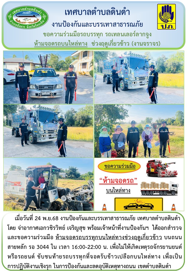 โดย จ่าอากาศเอกวชิรวิทย์ เจริญสุข พร้อมเจ้าหน้าที่งานป้องกันฯ ได้ออกสำรวจและขอความร่วมมือ ห้ามจอดรถบรรทุกบนไหล่ทางช่วงฤดูเกี่ยวข้าว บนถนนสายหลัก รอ 3044 ใน เวลา 16:00-22:00 น. เพื่อไม่ให้เกิดเหตุรถจักรยานยนต์ หรือรถยนต์ ขับชนท้ายรถบรรทุกที่จอดรับข้าวเปลือกบนไหล่ทาง เพื่อเป็นการปฏิบัติงานเชิงรุก ในการป้องกันและลดอุบัติเหตุทางถนน เขตตำบลดินดำ