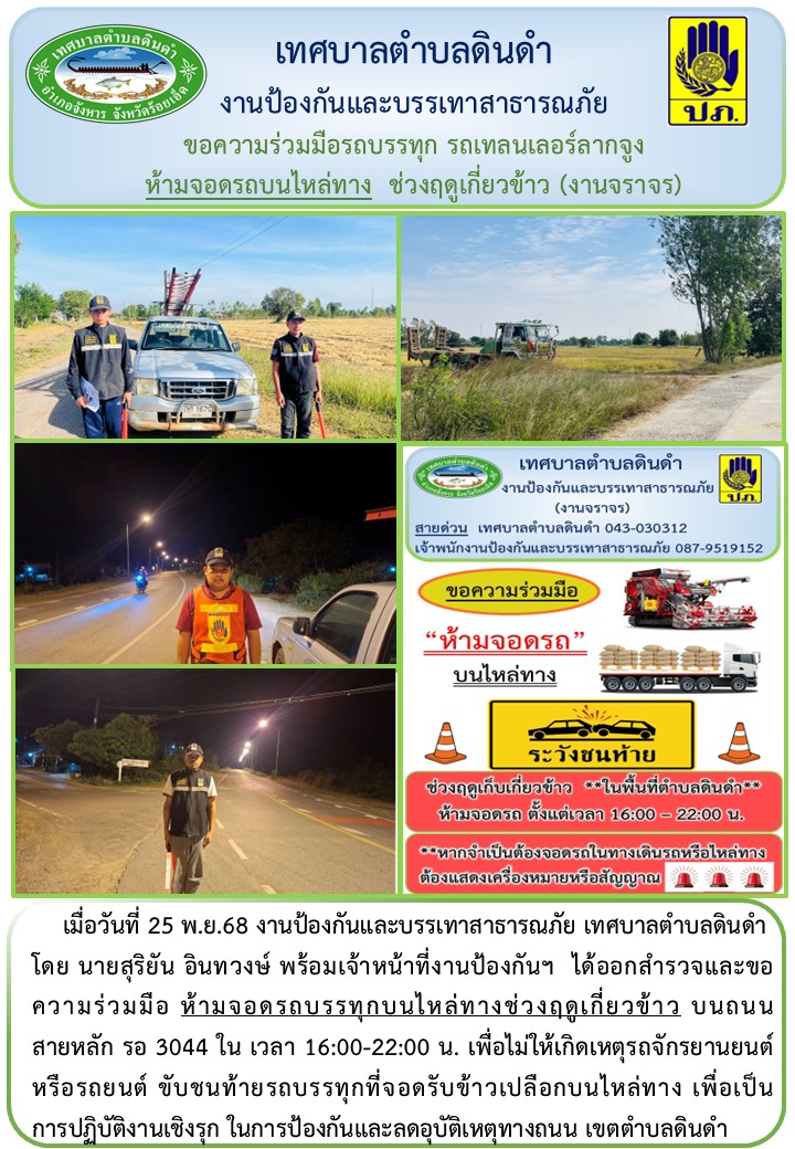 โดย นายสุริยัน อินทวงษ์ พร้อมเจ้าหน้าที่งานป้องกันฯ ได้ออกสำรวจและขอความร่วมมือ ห้ามจอดรถบรรทุกบนไหล่ทางช่วงฤดูเกี่ยวข้าว บนถนน สายหลัก รอ 3044 ใน เวลา 16:00-22:00 น. เพื่อไม่ให้เกิดเหตุรถจักรยานยนต์ หรือรถยนต์ ขับชนท้ายรถบรรทุกที่จอดรับข้าวเปลือกบนไหล่ทาง เพื่อเป็นการปฏิบัติงานเชิงรุก ในการป้องกันและลดอุบัติเหตุทางถนน เขตตำบลดินดำ