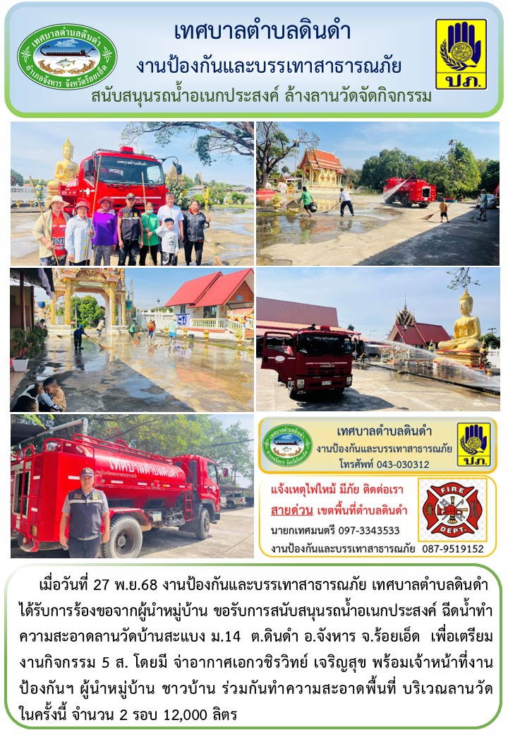 ได้รับการร้องขอจากผู้นำหมู่บ้าน ขอรับการสนับสนุนรถน้ำอเนกประสงค์ ฉีดน้ำทำความสะอาดลานวัดบ้านสะแบง ม.14 ต.ดินดำ อ.จังหาร จ.ร้อยเอ็ด เพื่อเตรียมงานกิจกรรม 5 ส. โดยมี จ่าอากาศเอกวชิรวิทย์ เจริญสุข พร้อมเจ้าหน้าที่งานป้องกันฯ ผู้นำหมู่บ้าน ชาวบ้าน ร่วมกันทำความสะอาดพื้นที่ บริเวณลานวัด ในครั้งนี้ จำนวน 2 รอบ 12,000 ลิตร