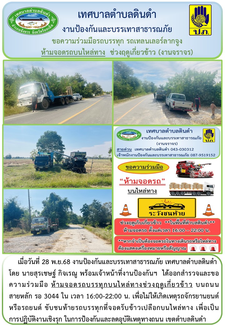 โดย นายสุรเชษฐ์ กิจเรณู พร้อมเจ้าหน้าที่งานป้องกันฯ ได้ออกสำรวจและขอความร่วมมือ ห้ามจอดรถบรรทุกบนไหล่ทางช่วงฤดูเกี่ยวข้าว บนถนน สายหลัก รอ 3044 ใน เวลา 16:00-22:00 น. เพื่อไม่ให้เกิดเหตุรถจักรยานยนต์ หรือรถยนต์ ขับชนท้ายรถบรรทุกที่จอดรับข้าวเปลือกบนไหล่ทาง เพื่อเป็นการปฏิบัติงานเชิงรุก ในการป้องกันและลดอุบัติเหตุทางถนน เขตตำบลดินดำ