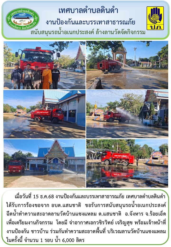 ได้รับการร้องขอจาก อบต.แสนชาติ ขอรับการสนับสนุนรถน้ำอเนกประสงค์ ฉีดน้ำทำความสะอาดลานวัดบ้านแซงแหลม ต.แสนชาติ อ.จังหาร จ.ร้อยเอ็ด เพื่อเตรียมงานกิจกรรม โดยมี จ่าอากาศเอกวชิรวิทย์ เจริญสุข พร้อมเจ้าหน้าที่งานป้องกัน ชาวบ้าน ร่วมกันทำความสะอาดพื้นที่ บริเวณลานวัดบ้านแซงแหลมในครั้งนี้ จำนวน 1 รอบ น้ำ 6,000 ลิตร