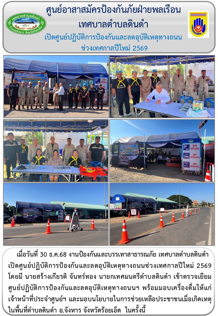 เปิดศูนย์ปฏิบัติการป้องกันและลดอุบัติเหตุทางถนนช่วงเทศกาลปีใหม่ 2569 โดยมี นายสร้างเกียรติ จันทร์ทอง นายกเทศมนตรีตำบลดินดำ เข้าตรวจเยียม ศูนย์ปฏิบัติการป้องกันและลดอุบัติเหตุทางถนนฯ พร้อมมอบเครื่องดื่มให้แก่เจ้าหน้าที่ประจำศูนย์ฯ และมอบนโยบายในการช่วยเหลือประชาชนเมื่อเกิดเหตุ ในพื้นที่ตำบลดินดำ อ.จังหาร จังหวัดร้อยเอ็ด ในครั้งนี้