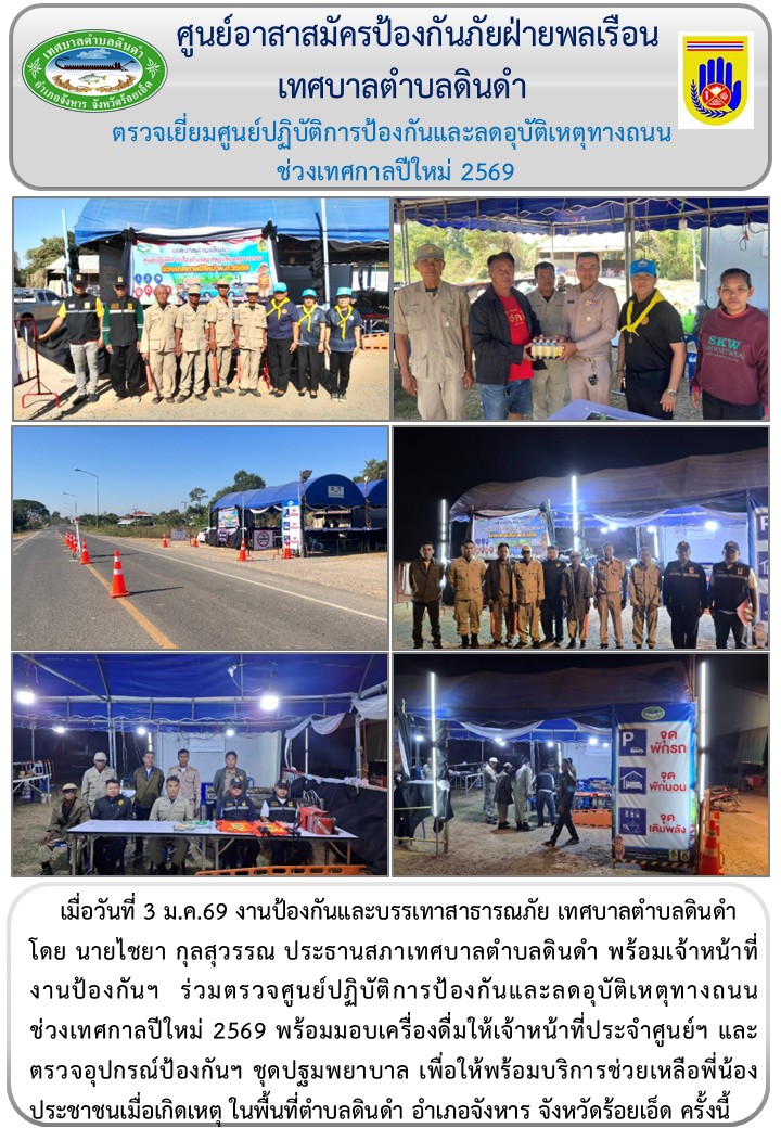 หัวข้อ :: นายไชยา กุลสุวรรณ ประธานสภาเทศบาลตำบลดินดำ พร้อมเจ้าหน้าที่งานป้องกันฯ ร่วมตรวจศูนย์ปฏิบัติการป้องกันและลดอุบัติเหตุทางถนนช่วงเทศกาลปีใหม่ 2569