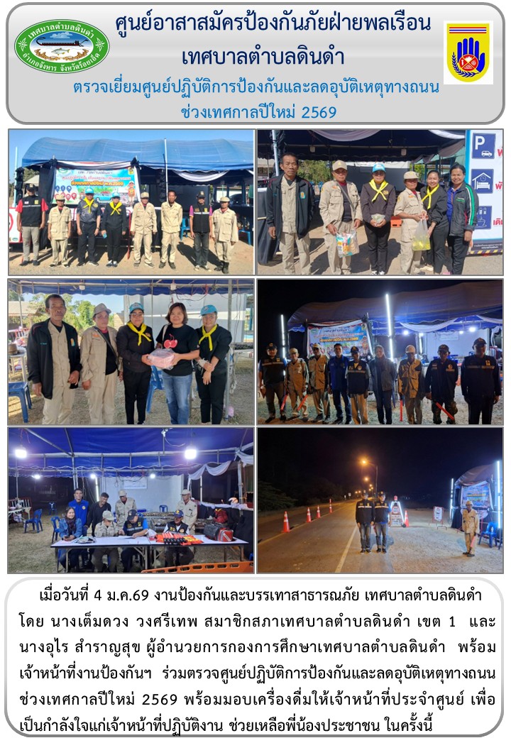 หัวข้อ :: นางเต็มดวง วงศรีเทพ สมาชิกสภาเทศบาลตำบลดินดำ เขต 1 และ นางอุไร สำราญสุข ผู้อำนวยการกองการศึกษาเทศบาลตำบลดินดำ พร้อมเจ้าหน้าที่งานป้องกันฯ ร่วมตรวจศูนย์ปฏิบัติการป้องกันและลดอุบัติเหตุทางถนนช่วงเทศกาลปีใหม่ 2569