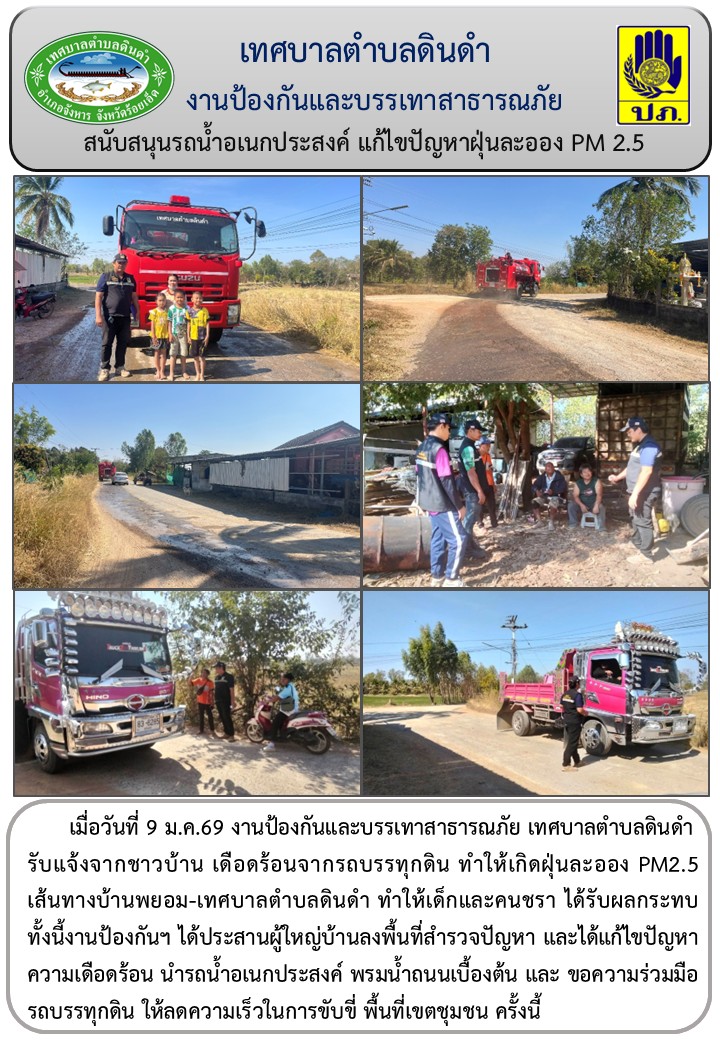 รับแจ้งจากชาวบ้าน เดือดร้อนจากรถบรรทุกดิน ทำให้เกิดฝุ่นละออง PM2.5 เส้นทางบ้านพยอม-เทศบาลตำบลดินดำ ทำให้เด็กและคนชรา ได้รับผลกระทบ ทั้งนี้งานป้องกันฯ ได้ประสานผู้ใหญ่บ้านลงพื้นที่สำรวจปัญหา และได้แก้ไขปัญหาความเดือดร้อน นำรถน้ำอเนกประสงค์ พรมน้ำถนนเบื้องต้น และ ขอความร่วมมือรถบรรทุกดิน ให้ลดความเร็วในการขับขี่ พื้นที่เขตชุมชน ครั้งนี้