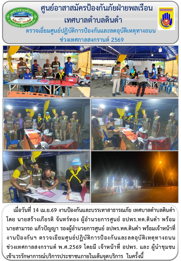 หัวข้อ :: นายสร้างเกียรติ จันทร์ทอง ผู้อำนวยการศูนย์ อปพร.ทต.ดินดำ พร้อม นายสามารถ แก้วปัญญา รองผู้อำนวยการศูนย์ อปพร.ทต.ดินดำ พร้อมเจ้าหน้าที่ งานป้องกันฯ ตรวจเยียมศูนย์ปฏิบัติการป้องกันและลดอุบัติเหตุทางถนนช่วงเทศกาลสงกรานต์ พ.ศ.2569