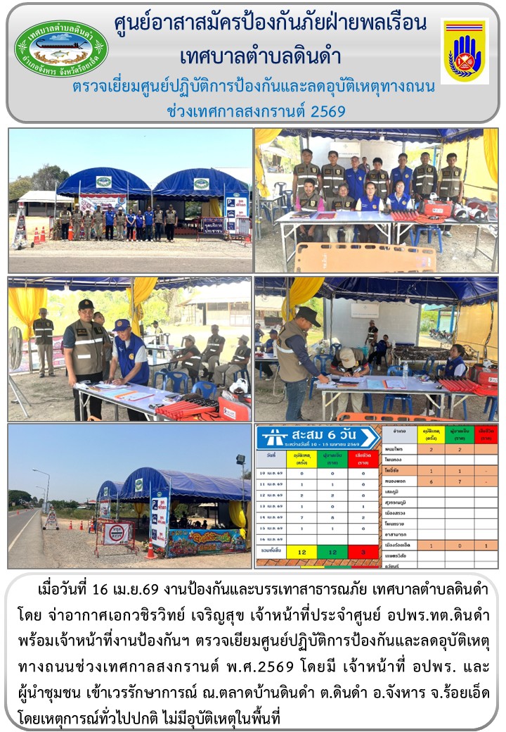 หัวข้อ :: จ่าอากาศเอกวชิรวิทย์ เจริญสุข เจ้าหน้าที่ประจำศูนย์ อปพร.ทต.ดินดำ พร้อมเจ้าหน้าที่งานป้องกันฯ ตรวจเยียมศูนย์ปฏิบัติการป้องกันและ ลดอุบัติเหตุทางถนนช่วงเทศกาลสงกรานต์ พ.ศ.2569 ณ.ตลาดบ้านดินดำ ต.ดินดำ อ.จังหาร จ.ร้อยเอ็ดโดยเหตุการณ์ทั่วไปปกติ ไม่มีอุบัติเหตุในพื้นที่
