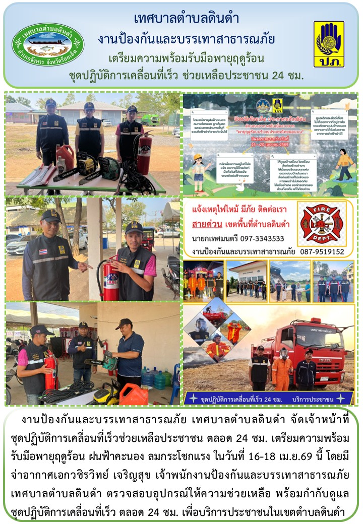 หัวข้อ :: งานป้องกันและบรรเทาสาธารณภัย เทศบาลตำบลดินดำ พร้อมชุดปฏิบัติการเคลื่อนที่เร็วช่วยเหลือประชาชน ตลอด 24 ชม. เตรียมความพร้อมรับมือพายุฤดูร้อน ฝนฟ้าคะนอง ลมกระโชกแรง ในวันที่ 16-18 เม.ย.69