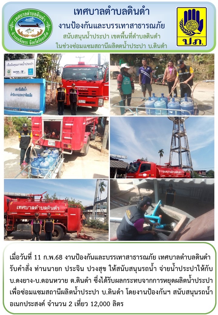 เมื่อวันที่ 11 กุมภาพันธ์ 68 งานป้องกันและบรรเทาสาธารณภัยเทศบาลตำบลดินดำ รับคำสั่ง ท่านนายกประจิน ปวงสุข ให้สนับสนุนรถน้ำ จ่ายน้ำประปาให้กับบ้านดงยาง-บ้านดอนหวาย ตำบลดินดำ อำเภอจังหาร จังหวัดร้อยเอ็ด ซึ่งได้รับผล กระทบจากการผลิตน้ำประปา เพื่อซ่อมแซมสถานีผลิตน้ำประปาบ้านดินดำ โดยงานป้องกันฯ และบรรเทาสาธารณภัย สนับสนุนรถน้ำอเนกประสงค์จำนวน 2 เที่ยว 1,200 ลิตร