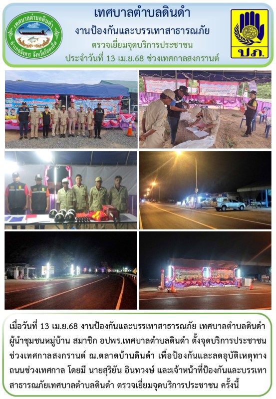 \r\nเปิดศูนย์ปฏิบัติการป้องกันและลดอุบัติเหตุทางถนนช่วงเทศกาลสงกรานต์ โดยมี ท่านปลัด นางณภัชนันท์ โพธิ์เปี้ยศรี และหัวหน้าส่วนฝ่ายเทศบาลตำบลดินดำ ร่วมเปิดศูนย์ปฏิบัติการฯ และมอบเครื่องดื่ม พูดคุย ให้กำลังใจเจ้าหน้าที่ประจำศูนย์ปฏิบัติการป้องกันและลดอุบัติเหตุฯ ครั้งนี้