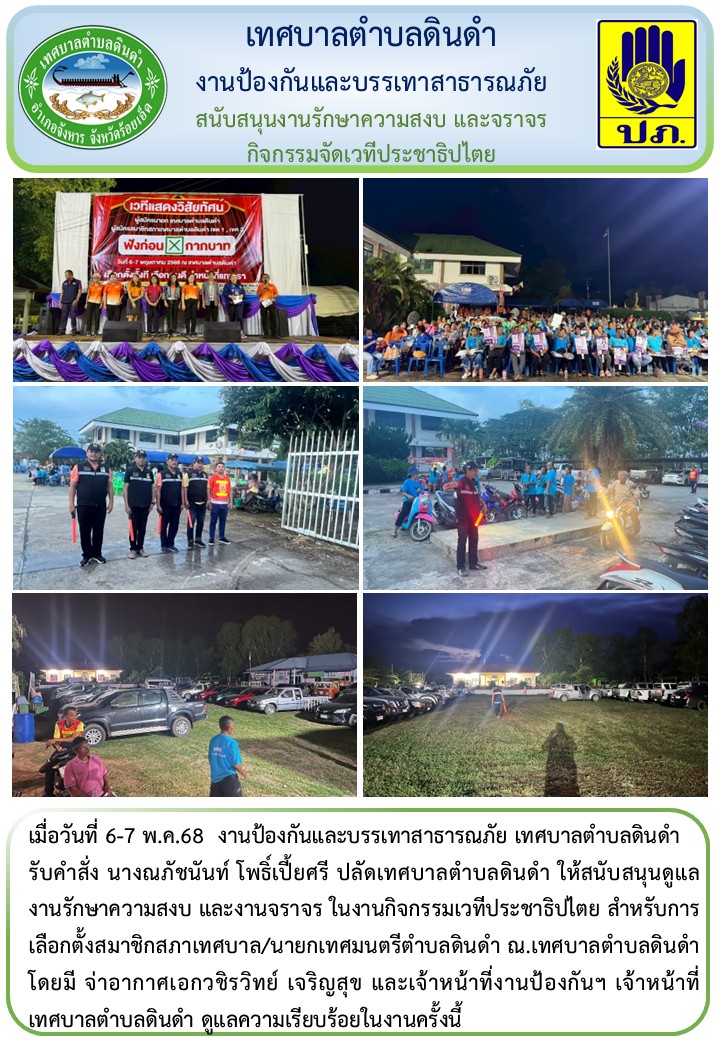 \r\nรับคำสั่ง นางณภัชนันท์ โพธิ์เปี้ยศรี ปลัดเทศบาลตำบลดินดำ ให้สนับสนุนดูแลงานรักษาความสงบ และงานจราจร ในงานกิจกรรมเวทีประชาธิปไตย สำหรับการเลือกตั้งสมาชิกสภาเทศบาล/นายกเทศมนตรีตำบลดินดำ ณ.เทศบาลตำบลดินดำ โดยมี จ่าอากาศเอกวชิรวิทย์ เจริญสุข และเจ้าหน้าที่งานป้องกันฯ เจ้าหน้าที่เทศบาลตำบลดินดำ ดูแลความเรียบร้อยในงานครั้งนี้
