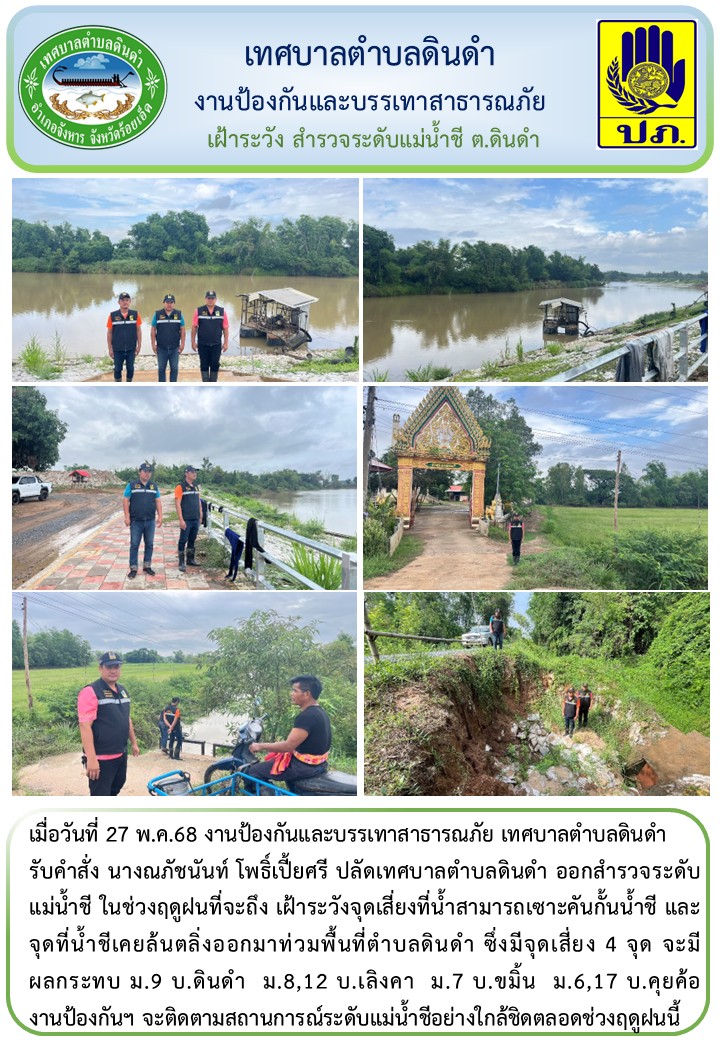 \r\nรับคำสั่ง นางณภัชนันท์ โพธิ์เปี้ยศรี ปลัดเทศบาลตำบลดินดำ ออกสำรวจระดับแม่น้ำชี ในช่วงฤดูฝนที่จะถึง เฝ้าระวังจุดเสี่ยงที่น้ำสามารถเซาะคันกั้นน้ำชี และจุดที่น้ำชีเคยล้นตลิ่งออกมาท่วมพื้นที่ตำบลดินดำ ซึ่งมีจุดเสี่ยง 4 จุด จะมีผลกระทบ ม.9 บ.ดินดำ ม.8,12 บ.เลิงคา ม.7 บ.ขมิ้น ม.6,17 บ.คุยค้อ งานป้องกันฯ จะติดตามสถานการณ์ระดับแม่น้ำชีอย่างใกล้ชิดตลอดช่วงฤดูฝนนี้