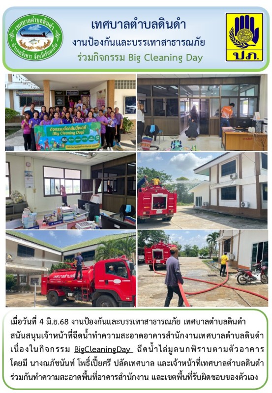 \r\nสนันสนุนเจ้าหน้าที่ฉีดน้ำทำความสะอาดอาคารสำนักงานเทศบาลตำบลดินดำ เนื่องในกิจกรรม BigCleaningDay ฉีดน้ำไล่มูลนกพิราบตาม ตัวอาคาร โดยมี นางณภัชนันท์ โพธิ์เปี้ยศรี ปลัดเทศบาล และเจ้าหน้าที่เทศบาลตำบลดินดำ ร่วมกันทำความสะอาดพื้นที่อาคารสำนักงาน