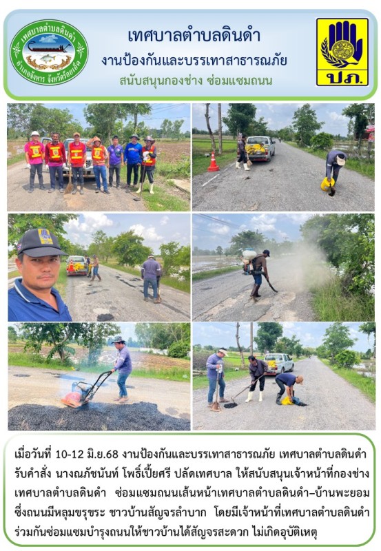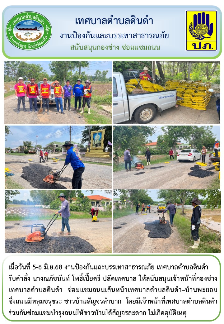 \r\nรับคำสั่ง นางณภัชนันท์ โพธิ์เปี้ยศรี ปลัดเทศบาล ให้สนับสนุนเจ้าหน้าที่กองช่าง เทศบาลตำบลดินดำ ซ่อมแซมถนนเส้นหน้าเทศบาลตำบลดินดำ–บ้านพะยอม ซึ่งถนนมีหลุมขรุขระ ชาวบ้านสัญจรลำบาก โดยมีเจ้าหน้าที่เทศบาลตำบลดินดำร่วมกันซ่อมแซมบำรุงถนนให้ชาวบ้านได้สัญจรสะดวก ไม่เกิดอุบัติเหตุ