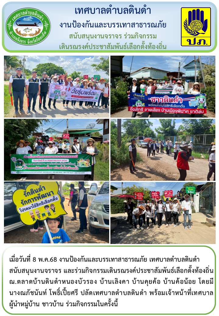 \r\nสนับสนุนงานจราจร และร่วมกิจกรรมเดินรณรงค์ประชาสัมพันธ์เลือกตั้งท้องถิ่น ณ.ตลาดบ้านดินดำหนองบัวรอง บ้านเลิงคา บ้านคุยค้อ บ้านค้อน้อย โดยมี นางณภัชนันท์ โพธิ์เปี้ยศรี ปลัดเทศบาลตำบลดินดำ พร้อมเจ้าหน้าที่เทศบาล ผู้นำหมู่บ้าน ชาวบ้าน ร่วมกิจกรรมในครั้งนี้