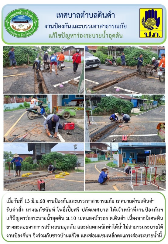 เมื่อวันที่ 13 มิ.ย.68 งานป้องกันและบรรเทาสาธารณภัย เทศบาลตำบลดินดำ รับคำสั่ง นางณภัชนันท์ โพธิ์เปี้ยศรี ปลัดเทศบาล ให้เจ้าหน้าที่ งานป้องกันฯ แก้ปัญหาร่องระบายน้ำอุดตัน ม.10 บ.หนองบัวรอง ต.ดินดำ เนื่องจากมีเศษหินยางมะตอยจากการสร้างถนนอุดตัน และฝนตกหนักทำให้น้ำไม่สามารถระบายได้ งานป้องกันฯ จึงร่วมกับชาวบ้านแก้ไข และซ่อมแซมเหล็กตะแกรงร่องระบายน้ำนี้