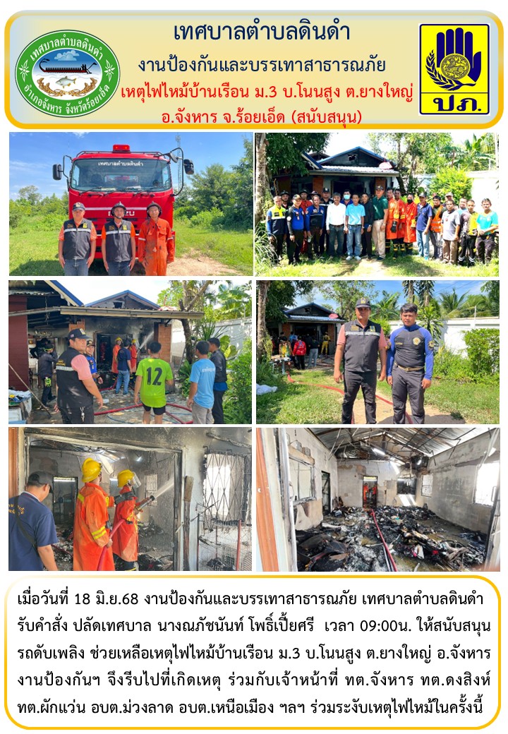 เมื่อวันที่ 18 มิ.ย.68 งานป้องกันและบรรเทาสาธารณภัย เทศบาลตำบลดินดำ รับคำสั่ง ปลัดเทศบาล นางณภัชนันท์ โพธิ์เปี้ยศรี เวลา 09:00น. ให้สนับสนุนรถดับเพลิง ช่วยเหลือเหตุไฟไหม้บ้านเรือน ม.3 บ.โนนสูง ต.ยางใหญ่ อ.จังหาร งานป้องกันฯ จึงรีบไปที่เกิดเหตุ ร่วมกับเจ้าหน้าที่ ทต.จังหาร ทต.ดงสิงห์ ทต.ผักแว่น อบต.ม่วงลาด อบต.เหนือเมือง ฯลฯ ร่วมระงับเหตุไฟไหม้ในครั้งนี้