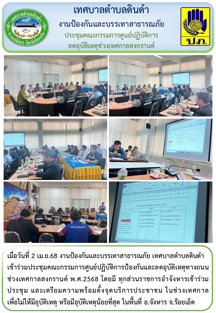 เมื่อวันที่ 2 เม.ย.68 งานป้องกันและบรรเทาสาธารณภัย เทศบาลตำบลดินดำ เข้าร่วมประชุมคณะกรรมการศูนย์ปฏิบัติการป้องกันและลดอุบัติเหตุทางถนนช่วงเทศกาลสงกรานต์ พ.ศ.2568 โดยมี ทุกส่วนราชการอำจังหารเข้าร่วมประชุม และเตรียมความพร้อมตั้งจุดบริการประชาชน ในช่วงเทศกาล เพื่อไม่ให้มีอุบัติเหตุ หรือมีอุบัติเหตุน้อยที่สุด ในพื้นที่ อ.จังหาร จ.ร้อยเอ็ด