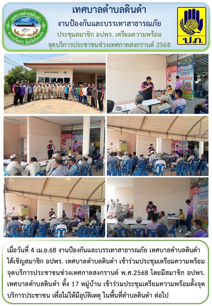 \r\nได้เชิญสมาชิก อปพร. เทศบาลตำบลดินดำ เข้าร่วมประชุมเตรียมความพร้อมจุดบริการประชาชนช่วงเทศกาลสงกรานต์ พ.ศ.2568 โดยมีสมาชิก อปพร. เทศบาลตำบลดินดำ ทั้ง 17 หมู่บ้าน เข้าร่วมประชุมเตรียมความพร้อมตั้งจุดบริการประชาชน เพื่อไม่ให้มีอุบัติเหตุ ในพื้นที่ตำบลดินดำ ต่อไป