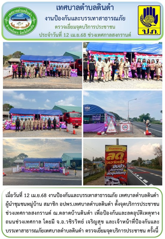 \r\nผู้นำชุมชนหมู่บ้าน สมาชิก อปพร.เทศบาลตำบลดินดำ ตั้งจุดบริการประชาชน ช่วงเทศกาลสงกรานต์ ณ.ตลาดบ้านดินดำ เพื่อป้องกันและลดอุบัติเหตุทางถนนช่วงเทศกาล โดยมี จ.อ.วชิรวิทย์ เจริญสุข และเจ้าหน้าที่ป้องกันและบรรเทาสาธารณภัยเทศบาลตำบลดินดำ ตรวจเยี่ยมจุดบริการประชาชน ครั้งนี้