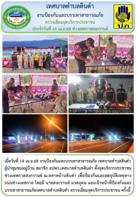\r\nผู้นำชุมชนหมู่บ้าน สมาชิก อปพร.เทศบาลตำบลดินดำ ตั้งจุดบริการประชาชน ช่วงเทศกาลสงกรานต์ ณ.ตลาดบ้านดินดำ เพื่อป้องกันและลดอุบัติเหตุทางถนนช่วงเทศกาล โดยมี นายสงกรานต์ แวดอุดม และเจ้าหน้าที่ป้องกันและบรรเทาสาธารณภัยเทศบาลตำบลดินดำ ตรวจเยี่ยมจุดบริการประชาชน ครั้งนี้