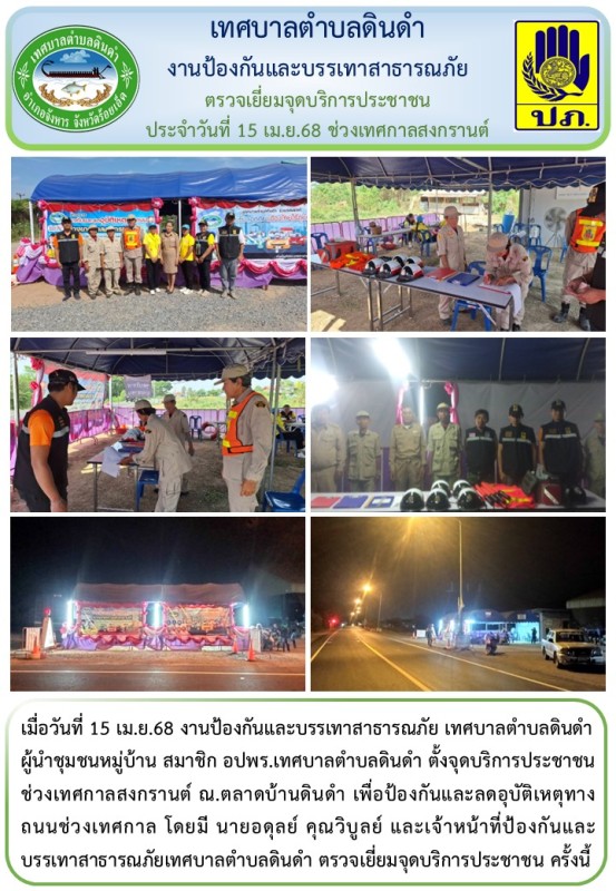 \r\nผู้นำชุมชนหมู่บ้าน สมาชิก อปพร.เทศบาลตำบลดินดำ ตั้งจุดบริการประชาชน ช่วงเทศกาลสงกรานต์ ณ.ตลาดบ้านดินดำ เพื่อป้องกันและลดอุบัติเหตุทางถนนช่วงเทศกาล โดยมี นายอดุลย์ คุณวิบูลย์ และเจ้าหน้าที่ป้องกันและบรรเทาสาธารณภัยเทศบาลตำบลดินดำ ตรวจเยี่ยมจุดบริการประชาชน ครั้งนี้