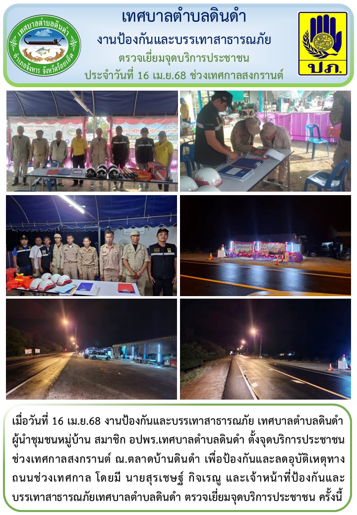 \r\nผู้นำชุมชนหมู่บ้าน สมาชิก อปพร.เทศบาลตำบลดินดำ ตั้งจุดบริการประชาชน ช่วงเทศกาลสงกรานต์ ณ.ตลาดบ้านดินดำ เพื่อป้องกันและลดอุบัติเหตุทางถนนช่วงเทศกาล โดยมี นายสุรเชษฐ์ กิจเรณู และเจ้าหน้าที่ป้องกันและบรรเทาสาธารณภัยเทศบาลตำบลดินดำ ตรวจเยี่ยมจุดบริการประชาชน ครั้งนี้