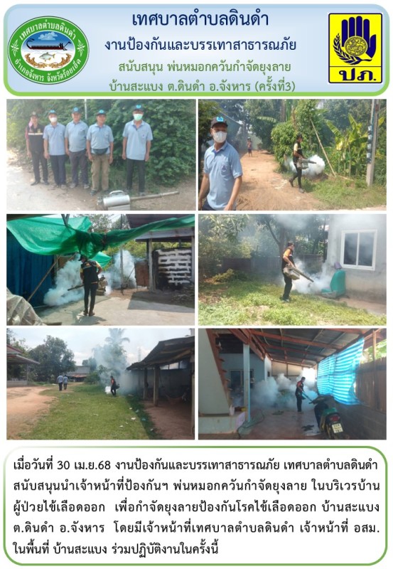 \r\nสนับสนุนนำเจ้าหน้าที่ป้องกันฯ พ่นหมอกควันกำจัดยุงลาย ในบริเวรบ้านผู้ป่วยไข้เลือดออก เพื่อกำจัดยุงลายป้องกันโรคไข้เลือดออก บ้านสะแบง ต.ดินดำ อ.จังหาร โดยมีเจ้าหน้าที่เทศบาลตำบลดินดำ เจ้าหน้าที่ อสม. ในพื้นที่ บ้านสะแบง ร่วมปฏิบัติงานในครั้งนี้