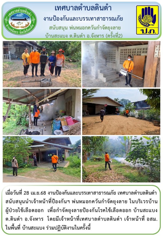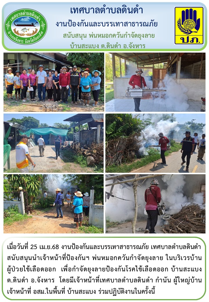 \r\nสนับสนุนนำเจ้าหน้าที่ป้องกันฯ พ่นหมอกควันกำจัดยุงลาย ในบริเวรบ้านผู้ป่วยไข้เลือดออก เพื่อกำจัดยุงลายป้องกันโรคไข้เลือดออก บ้านสะแบง ต.ดินดำ อ.จังหาร โดยมีเจ้าหน้าที่เทศบาลตำบลดินดำ กำนัน ผู้ใหญ่บ้าน เจ้าหน้าที่ อสม.ในพื้นที่ บ้านสะแบง ร่วมปฏิบัติงานในครั้งนี้
