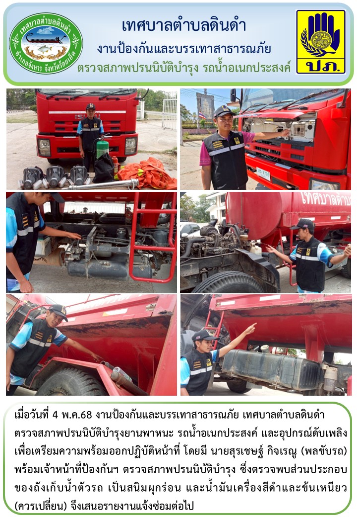 \r\nตรวจสภาพปรนนิบัติบำรุงยานพาหนะ รถน้ำอเนกประสงค์ และอุปกรณ์ดับเพลิง เพื่อเตรียมความพร้อมออกปฏิบัติหน้าที่ โดยมี นายสุรเชษฐ์ กิจเรณู (พลขับรถ) พร้อมเจ้าหน้าที่ป้องกันฯ ตรวจสภาพปรนนิบัติบำรุง ซึ่งตรวจพบส่วนประกอบของถังเก็บน้ำตัวรถ เป็นสนิมผุกร่อน และน้ำมันเครื่องสีดำและข้นเหนียว (ควรเปลี่ยน) จึงเสนอรายงานแจ้งซ่อมต่อไป
