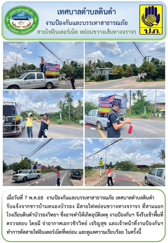 \r\nรับแจ้งจากชาวบ้านหนองบัวรอง มีสายไฟหย่อนขวางทางจราจร ที่สามแยกโรงเรียนดินดำบัวรองวิทยา ซึ่งอาจทำให้เกิดอุบัติเหตุ งานป้องกันฯ จึงรีบเข้าพื้นที่ตรวจสอบ โดยมี จ่าอากาศเอกวชิรวิทย์ เจริญสุข และเจ้าหน้าที่งานป้องกันฯ ทำการตัดสายไฟอินเตอร์เน็ตที่หย่อน และดูแลความเรียบร้อย ในครั้งนี้
