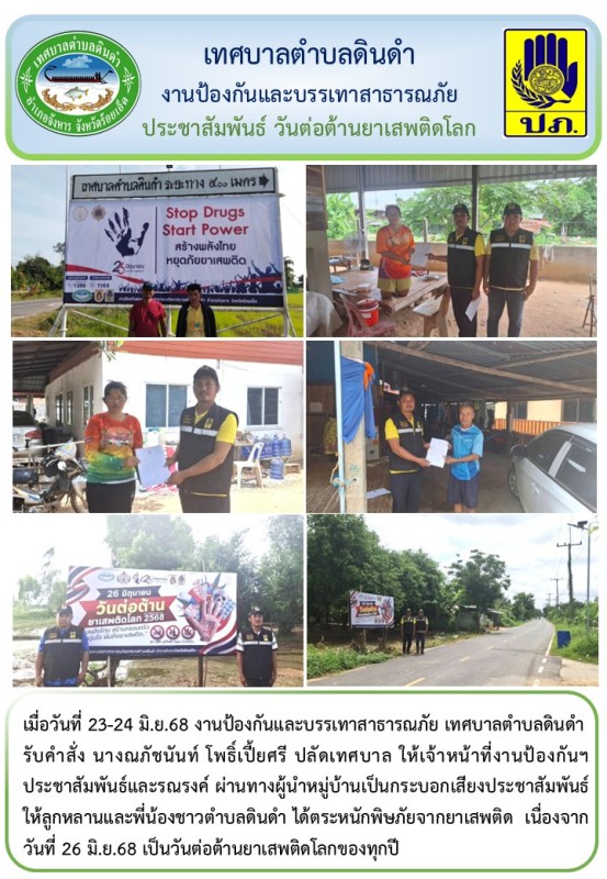 เมื่อวันที่ 23-24 มิ.ย.68 งานป้องกันและบรรเทาสาธารณภัย เทศบาลตำบลดินดำ รับคำสั่ง นางณภัชนันท์ โพธิ์เปี้ยศรี ปลัดเทศบาล ให้เจ้าหน้าที่งานป้องกันฯ ประชาสัมพันธ์และรณรงค์ ผ่านทางผู้นำหมู่บ้านเป็นกระบอกเสียงประชาสัมพันธ์ ให้ลูกหลานและพี่น้องชาวตำบลดินดำ ได้ตระหนักพิษภัยจากยาเสพติด เนื่องจาก วันที่ 26 มิ.ย.68 เป็นวันต่อต้านยาเสพติดโลกของทุกปี