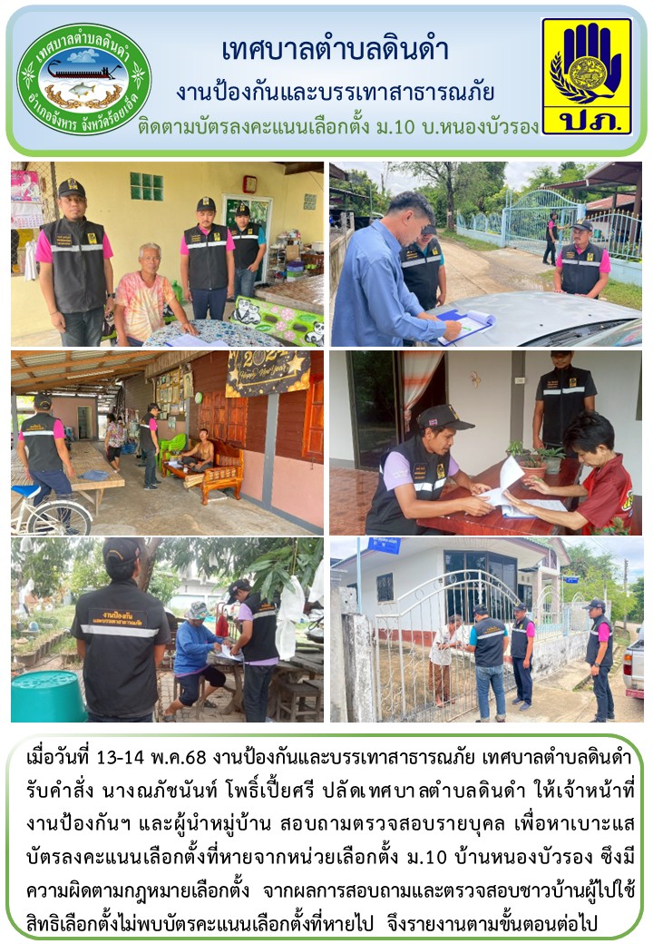 \r\nรับคำสั่ง นางณภัชนันท์ โพธิ์เปี้ยศรี ปลัดเทศบาลตำบลดินดำ ให้เจ้าหน้าที่งานป้องกันฯ และผู้นำหมู่บ้าน สอบถามตรวจสอบรายบุคล เพื่อหาเบาะแสบัตรลงคะแนนเลือกตั้งที่หายจากหน่วยเลือกตั้ง ม.10 บ้านหนองบัวรอง ซึงมีความผิดตามกฎหมายเลือกตั้ง จากผลการสอบถามและตรวจสอบชาวบ้านผู้ไปใช้สิทธิเลือกตั้งไม่พบบัตรคะแนนเลือกตั้งที่หายไป จึงรายงานตามขั้นตอนต่อไป