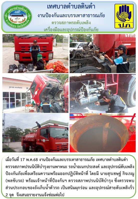 \r\nตรวจสภาพปรนนิบัติบำรุงยานพาหนะ รถน้ำอเนกประสงค์ และอุปกรณ์ดับเพลิง ป้องกันภัยเพื่อเตรียมความพร้อมออกปฏิบัติหน้าที่ โดยมี นายสุรเชษฐ์ กิจเรณู (พลขับรถ) พร้อมเจ้าหน้าที่ป้องกันฯ ตรวจสภาพปรนนิบัติบำรุง ซึ่งตรวจพบส่วนประกอบของถังเก็บน้ำตัวรถ เป็นสนิมผุกร่อน และอุปกรณ์สายดับเพลิงรั่ว 2 จุด จึงเสนอรายงานแจ้งซ่อมต่อไป