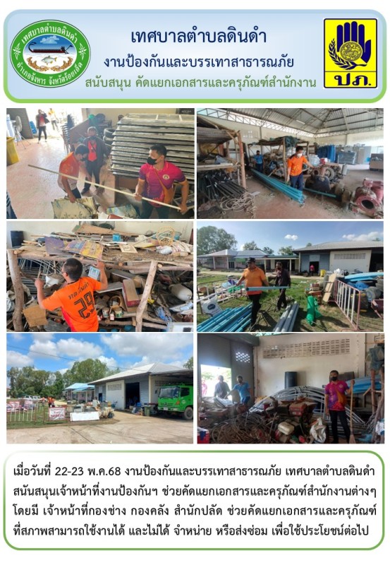\r\nสนันสนุนเจ้าหน้าที่งานป้องกันฯ ช่วยคัดแยกเอกสารและครุภัณฑ์สำนักงานต่างๆ โดยมี เจ้าหน้าที่กองช่าง กองคลัง สำนักปลัด ช่วยคัดแยกเอกสารและครุภัณฑ์ ที่สภาพสามารถใช้งานได้ และไม่ได้ จำหน่าย หรือส่งซ่อม เพื่อใช้ประโยชน์ต่อไป