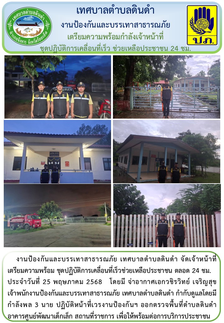 งานป้องกันและบรรเทาสาธารณภัย เทศบาลตำบลดินดำ จัดเจ้าหน้าที่ เตรียมความพร้อม ชุดปฏิบัติการเคลื่อนที่เร็วช่วยเหลือประชาชน ตลอด 24 ชม. ประจำวันที่ 25 พฤษภาคม 2568 โดยมี จ่าอากาศเอกวชิรวิทย์ เจริญสุข เจ้าพนักงานป้องกันและบรรเทาสาธารณภัย เทศบาลตำบลดินดำ กำกับดูแลโดยมีกำลังพล 3 นาย ปฏิบัติหน้าที่เวรงานป้องกันฯ ออกตรวจพื้นที่ตำบลดินดำ อาคารศูนย์พัฒนาเด็กเล็ก สถานที่ราชการ เพื่อให้พร้อมต่อการบริการประชาชน