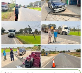 สนับสนุนงานจราจร และรักษาความปลอดภัย เหตุรถเทนเลอร์เกี่ยวสายไฟฟ้าขาด เสาไฟฟ้าหักโค่น ล้มทับรถยนต์ชาวบ้าน เสียหาย 1 คัน