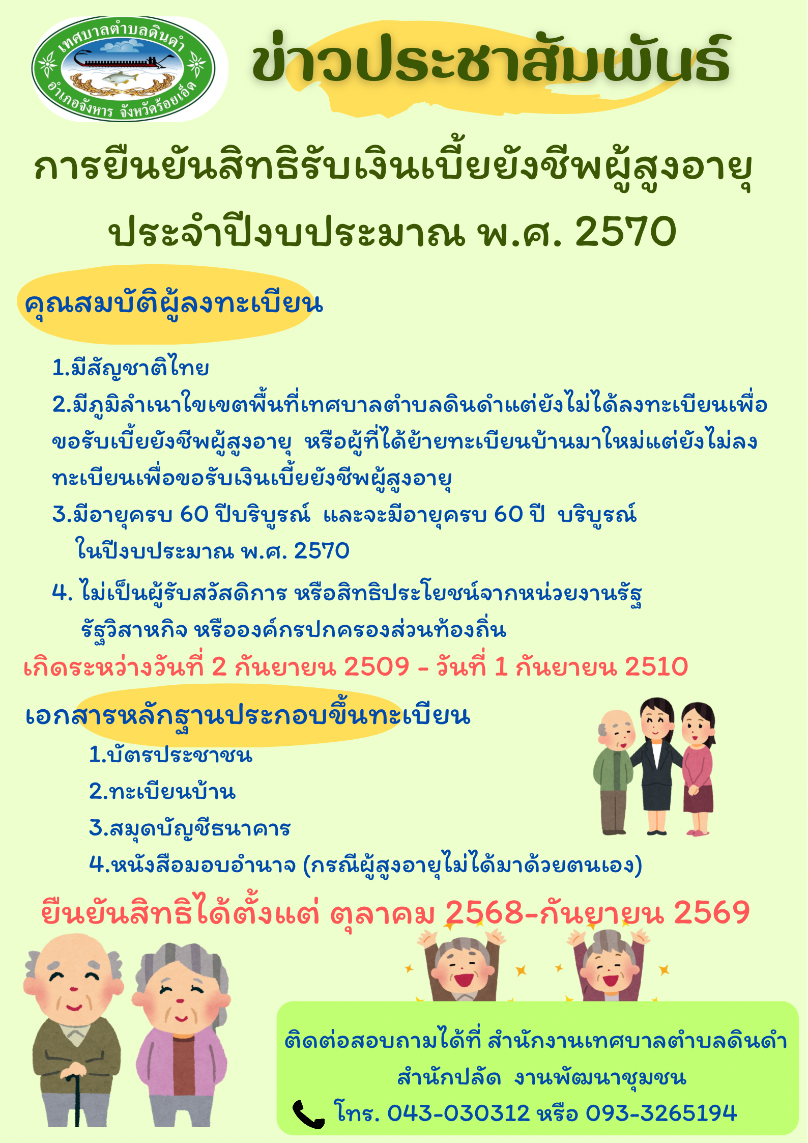 หัวข้อ :: ประชาสัมพันธ์การยืนยันสิทธิขอรับเงินเบี้ยยังชีพผู้สูงอายุ ประจำปีงบประมาณ พ.ศ. 2570